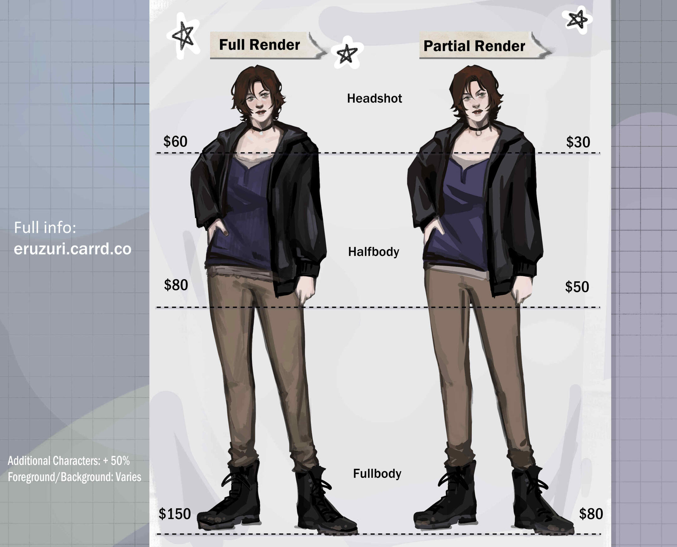 Complex/Background/Foreground components: Price will vary. All commissions come with a plain color background at no additional cost.